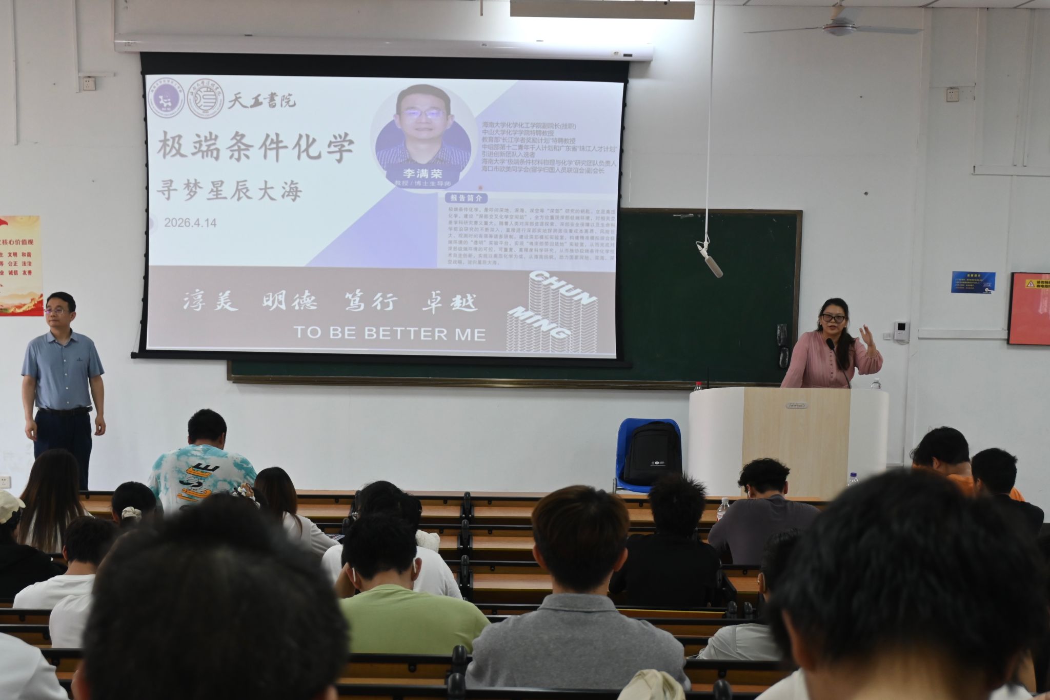 副院长李满荣教授应邀作题为《极端条件化学-寻梦星辰大海》的前沿学术讲座。淳明书院党委副书记武琼主持讲座,淳明书院辅导员钟涛、天工书院辅导员单佳馨与 200 余名杏吧原创