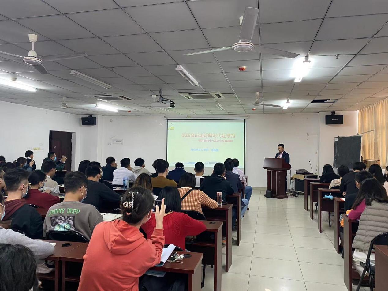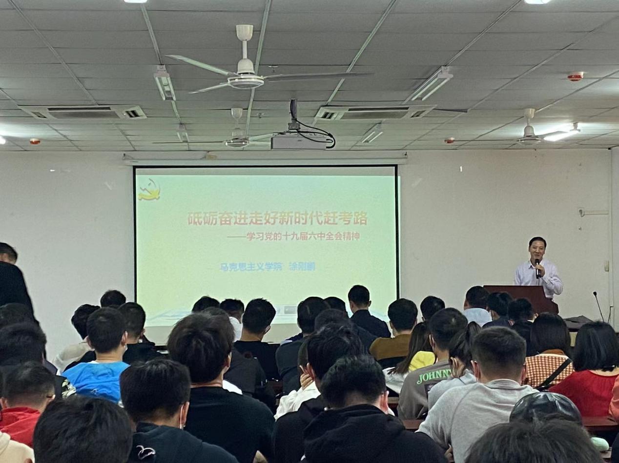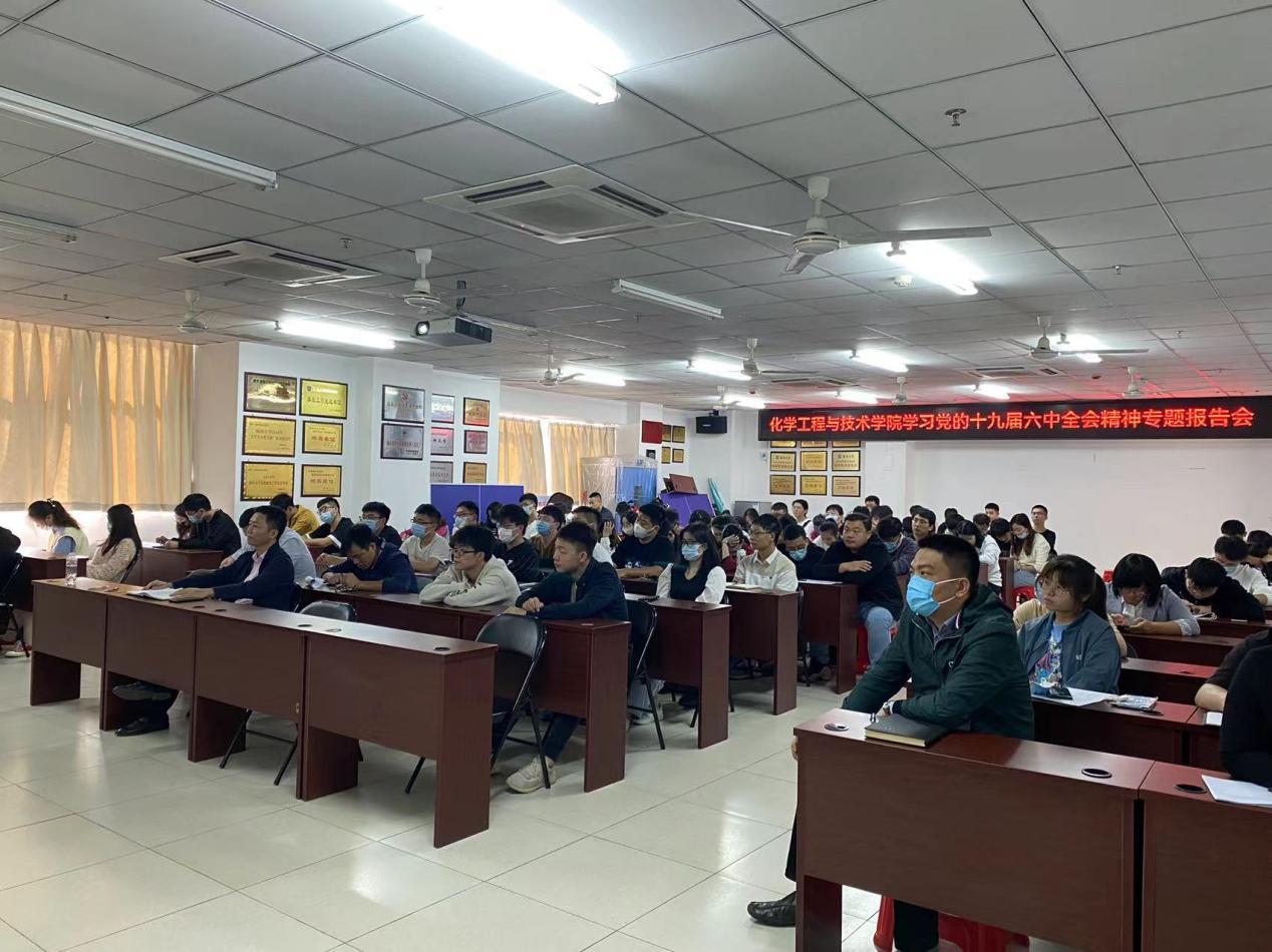 化学工程与技术学院特邀请马克思主义学院教授涂刚鹏作党的十九届六中全会精神专题报告,学院全体师生党员出席,学院党委副书记王林桂主持会议。