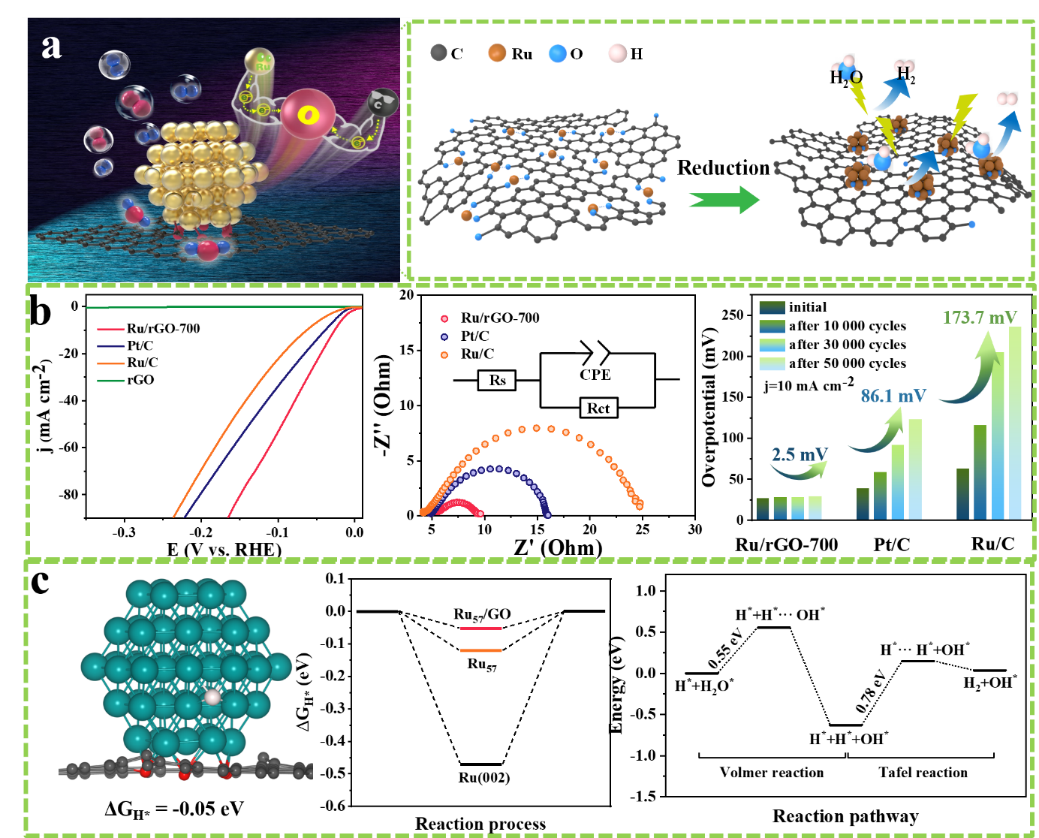 团队利用氧化石墨烯(GO)的富氧官能团吸附Ru物种,并通过退火原位生成还原氧化石墨烯负载的Ru纳米粒子析氢催化剂(Ru/rGO-700)。Ru/rGO-700在碱性条件中达到10 mA cm-2的电流密度下仅仅需要26 mV的超低过电位,同时载体和锚定的Ru纳米粒子之间的Ru-O键引起的强相互作用赋予了催化剂理想的稳定性,在经过50,000圈耐久性测试循环后,催化剂的活性几乎没有衰减。密度泛函理论(DFT)计算表明,阴离子氧的引入导致Ru纳米粒子的缺电子特性,这削弱了Ru-H键并利于水的解离和氢的解吸。此外,综合晶体轨道哈密顿布居(ICOHP)证实电子空穴的引入削弱了Ru原子之间的反键相互作用,从而大大提高了催化剂的稳定性。