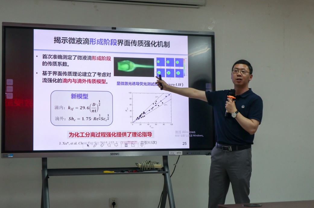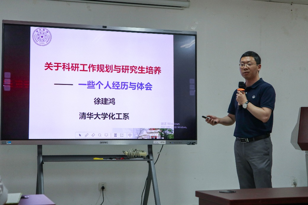 徐建鸿教授以《关于科研工作规划与研究生培养》为题,就如何选择科研方向与确定科研规划、形成个人标签,如何建设团队文化、营造一个温暖的“家”两大问题展开,结合个人经历,为师生分享了其科研历程、体会及研究成果。报告中,徐教授介绍了全球微化工技术发展历程及其课题组在微化工与微流控方面的原创性研究成果,展示了微化工技术在纳米碳酸钙颗粒制备、己内酰胺萃取分离等大型化工生产和高端精细化学品高效安全合成等领域的成功应用案例,展望了微化工技术未来工业应用前景及面临的挑战。最后,徐教授向大家传授了其指导研究生的心得体会,分享了其团队多名研究生的发展历程及人生感悟,充分展现了其课题组团队文化建设的良好成效。徐教授报告语言风趣幽默,内容丰富多彩,气氛热烈融洽。