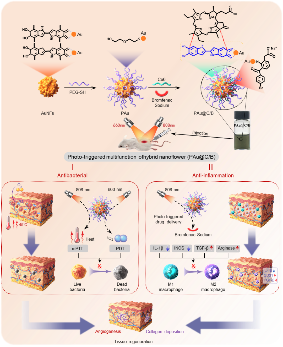 图1 复合金纳米花(PAu@C/B)的合成及促进感染性皮肤组织再生示意图