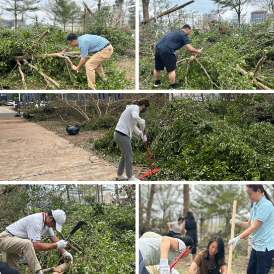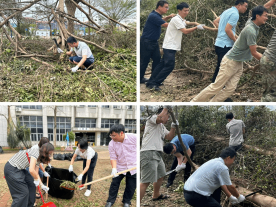 学院领导干部充分发挥表率作用,身先士卒,走在工作前列。扛起铲子、拿起清洁工具,一遍遍清理路上散落的树叶,一次次抬起粗壮的树枝,用行动践行着“迎‘风’而上,逆‘风’而行”的担当。