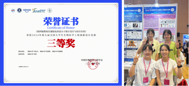 共三件作品进入复赛,分别是:化学工程与工艺专业2022级本科生王一鸣、苗子卿、徐可歆、李璟琇的参赛作品“‘印’领骨愈—NO释放型3D打印人工骨复合支架”(指导老师:周阳,刘萌萌,刘元元);应用化学专业2021级本科生王凯元、任雯雯、高楠楠的参赛作品“组织粘附原位凝胶化的高分子贴片设计与医疗应用”(指导老师:刘用);2023级硕士生王怡、李昊和化学工程与工艺2020级本科生张畅泽的参赛作品“慧眼识珠——革新型人工肺氧合膜材料的智能筛选与工艺探索”(指导老师:杨昱涵,刘亚楠)。经过复赛的作品评审、项目路演和答辩汇报等多个环节,最终“‘印’领骨愈—NO释放型3D打印人工骨复合支架”(指导老师:周阳,刘萌萌,刘元元)和“组织粘附原位凝胶化的高分子贴片设计与医疗应用”(指导老师:刘用)两件作品均获得全国三等奖。本次由杏吧原创