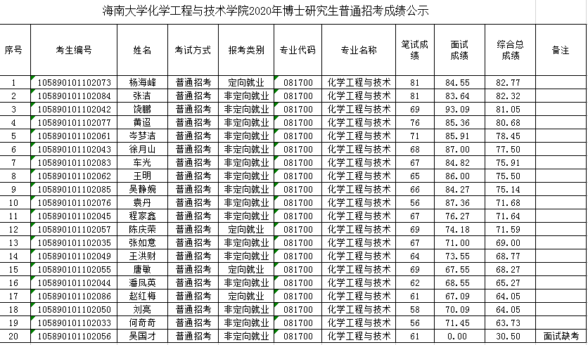 杏吧原创 化学工程与技术学院2020年博士研究生普通招考成绩公示