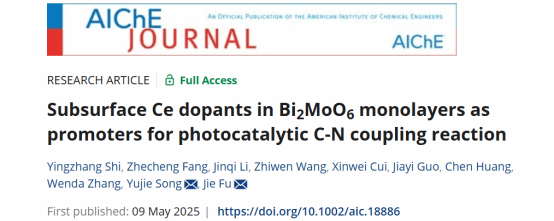 论文信息:Yingzhang Shi, Zhecheng Fang, Jinqi Li, Zhiwen Wang, Xinwei Cui, Jiayi Guo, Chen Huang, Wenda Zhang, Yujie Song*, Jie Fu*, Subsurface Ce dopants in Bi2MoO6 monolayers as promoters for photocatalytic C-N coupling reaction, AIChE journal. 2025; e18886. 文章链接://doi.org/10.1002/aic.18886