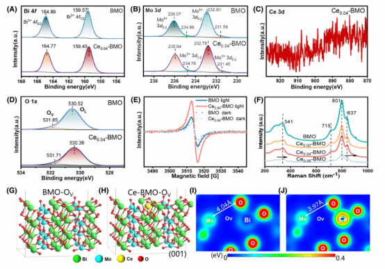 研究发现,将Ce掺杂进次表面改变了BMO的表面微观结构,诱导了氧空位( OV )和受阻的路易斯酸碱对( FLPs )的形成。