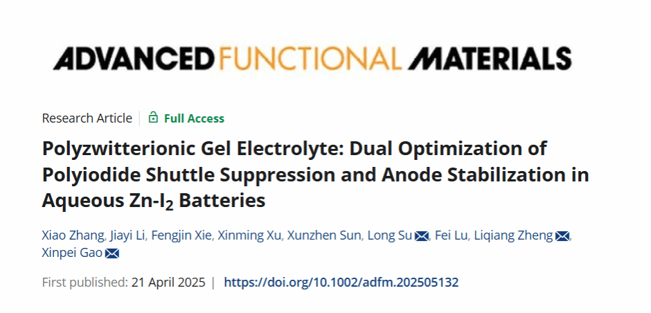 能源胶体与界面化学团队在材料领域期刊《Advanced Functional Materials》上发表题为“Polyzwitterionic Gel Electrolyte: Dual Optimization of Polyiodide Shuttle Suppression and Anode Stabilization in Aqueous Zn-I2 Batteries”的研究论文。该研究设计了一种聚两性离子凝胶电解质(PZG),实现了对水系锌碘电池中阴极和阳极的双重稳定调控。