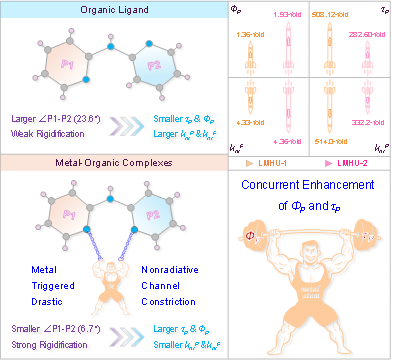 金属有机室温磷光材料因其独特的光学性质与广泛的应用前景而备受关注。然而,如何在单一材料中实现磷光的动态调控,并同步提升磷光量子产率与超长寿命仍然存在巨大的挑战。在这项研究中,该团队成功构建了两例金属有机配合物材料(LMHU-1和LMHU-2),并且它们展现出显著的温度依赖的动态磷光现象。值得注意的是,通过调控体系的温度可以实现从低温下的蓝色长余辉发光到常温下的绿色磷光的可逆发射转换,并且这些材料在超过104°C的高温下仍然可以观察到明显的长持续磷光。详尽的光谱测试结果表明,金属的配位作用显著抑制了配体内部的非辐射衰减通道,从而大幅提升了其磷光效率。其非辐射衰减速率常数(knrP)最高被抑制514.0倍,而磷光寿命(τP)和量子产率(ΦP)分别最高提升了508.12倍和1.93倍。DFT/TD-DFT计算阐明了这些材料的磷光发射源于配体中心的三重激发态光子辐射。鉴于这些材料所具备的可调磷光特性,其被用于信息加密/解密与光学防伪应用中并展现出巨大的应用潜力。总的来说,该研究不仅为解决ΦP与τP同步提升的难题提供了新的策略,也为开发具有动态超长室温磷光特性的金属有机材料在信息安全领域的应用提供了可行方案。
