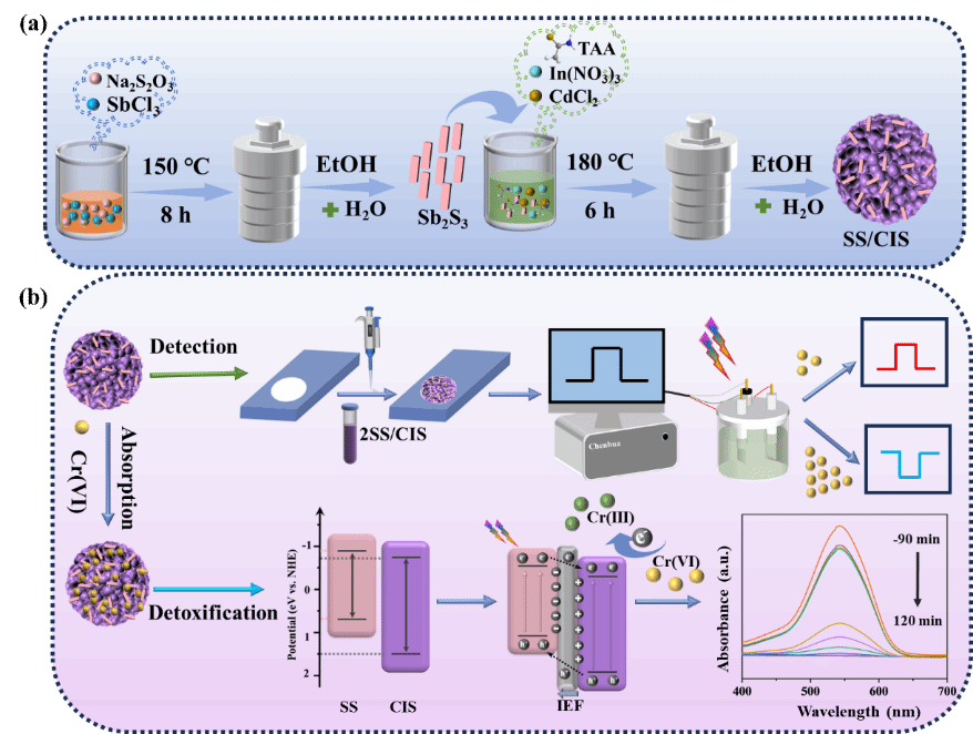 工作1:设计合成了一种双功能Sb2S3/CdIn2S4 p-n异质结,同时实现了Cr(VI)的光电化学灵敏检测和光催化解毒。所制备的光电化学传感器在稳定性、选择性和重现性方面均达到实用水平,在环境领域展现出重要应用潜力。该成果以“Difunctional Sb2S3/CdIn2S4 p-n Heterojunction: A Novel Material for Ultra-Wide-Range Photoelectrochemical Sensor with Photocurrent-Polarity Switching and Photocatalytic Detoxification of Cr(VI)”为题发表于《Chemical Engineering Journal》期刊。杏吧原创