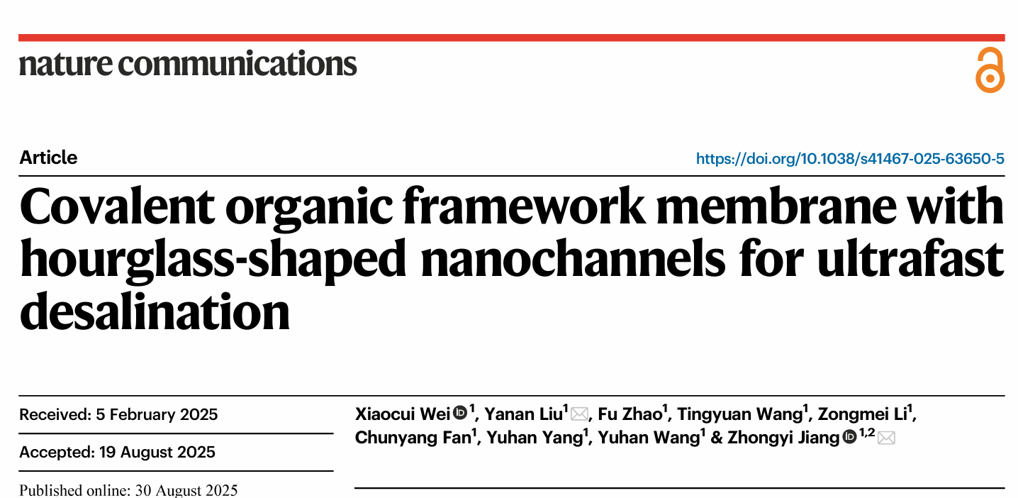 海水淡化作为开发非常规水资源的关键途径,有望缓解全球日益严峻的水资源短缺。膜法凭借高能效与易于规模化的特性,在海水淡化中展现出突出优势。共价有机框架(COF)是一类纳米多孔晶体聚合物,兼具高比表面积与孔隙率、可调的孔道结构、可工程化的表面化学以及良好的化学稳定性,被视为下一代海水淡化膜的有力候选。然则,COF膜的纳米通道仍受“渗透性—选择性”的制约。此外,直径小于1.0 nm的COF纳米通道迄今仍难以实现。