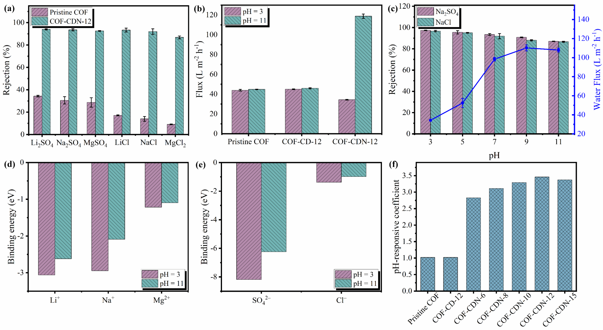 同时,氨基环糊精上的氨基基团赋予纳米通道pH响应性,通过可逆质子化/去质子化动态调节有效孔径与表面电荷(图2-3)。所制备的膜兼具高水通量与高盐截留率,并表现出高长周期稳定性与pH循环耐久性。该研究有望为构建COF膜的纳米通道提供新思路,从而在多类化学分离中缓解渗透性—选择性的制约。