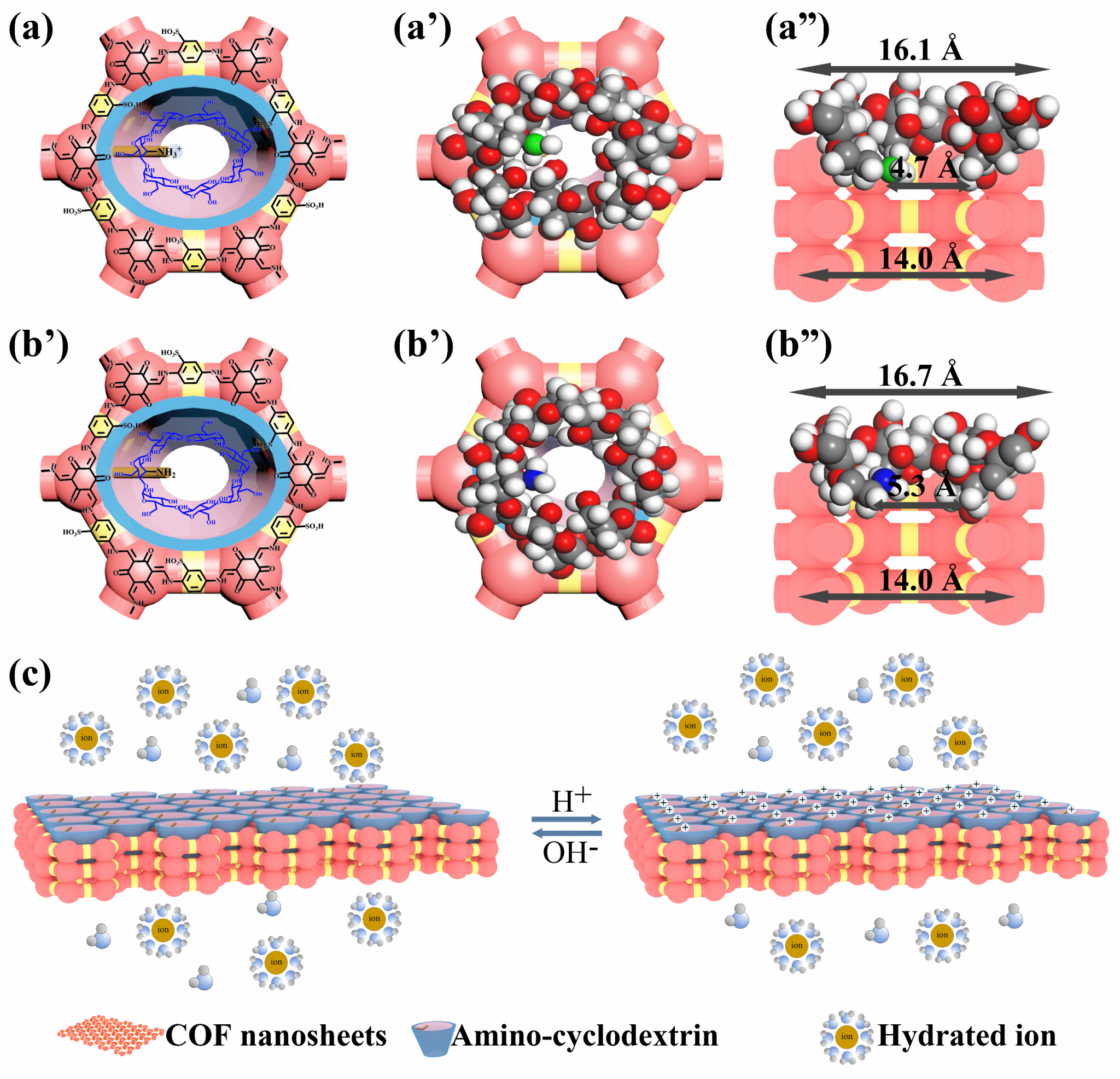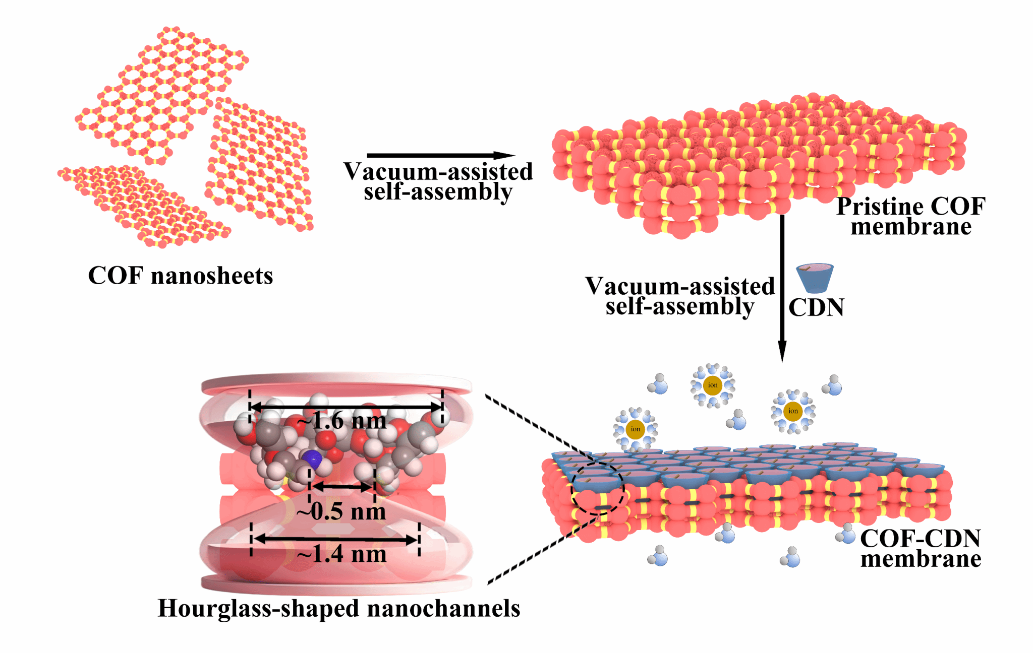 本文通过将氨基环糊精纳米粒子组装至COF膜上,构筑了具有沙漏形纳米通道的COF膜,并对其脱盐性能进行了评估(图1)。所得通道由氨基环糊精特征空腔形成的亲水锥形入口(约1.6 nm)与疏水喷口(约0.5 nm),以及COF内在的纳米孔(约1.4 nm)组成。亲水锥形入口有利于水分子进入,而疏水喷口与同质纳米通道协同实现快速水传输。