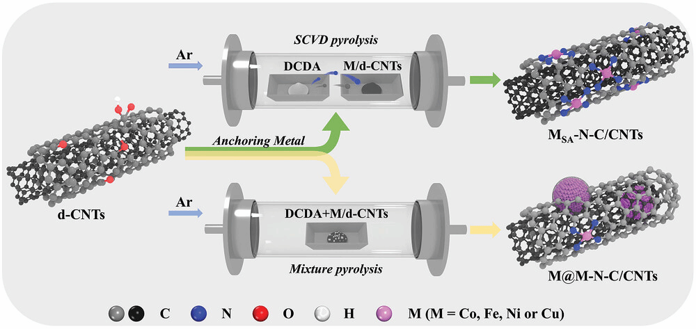 功能分子器件团队提出了一系列创新设计策略,以精准调控氧物种在活性位点上的吸附与还原行为。团队发展了一种基于“分离气相化学沉积”的普适性方法,在碳纳米管载体上构筑同轴钴-氮-碳单原子催化剂。所制备的同轴结构单原子催化剂在酸性电解液中展现出优异的氧还原活性、选择性与长期稳定性,实现了超过100小时的稳定高效电合成过氧化氢性能。相关成果以Coaxial Metal-Nitrogen–Carbon Single-Atom Catalysts Boost Acid Hydrogen Peroxide Production为题发表于材料领域中国科学院一区TOP期刊Advanced Functional Materials杂志,杏吧原创