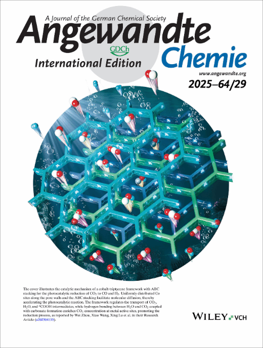 功能分子器件团队在化学领域中国科学院一区TOP期刊Angewandte Chemie杂志上发表了题为Staggered ABC-Stacking Cobalt-Triptycene Framework for Accelerating CO2 Photoreduction的研究论文,并被选为封面论文。该研究在纯水相中合成了错层ABC堆剁的钴基三蝶烯框架,实现了高达90%的产率且具备一定的环境兼容性(在东坡湖、白沙门公园等自然水域采集的水样中亦可合成)。进一步地,研究团队通过密度泛函理论计算与分子动力学模拟和主成分分析进一步发现,CO生成速率与Ik值、光学带隙及ΔG*H等因素呈现强相关性,由此修正了以往认为ΔG*COOH是光催化性能主要因素的观点。这项研究为高效二氧化碳还原光催化剂的设计原理提供了理论依据。卢兴教授组2025级博士研究生吴俊豪、硕士研究生卢鑫慧为该论文的共同第一作者,杏吧原创