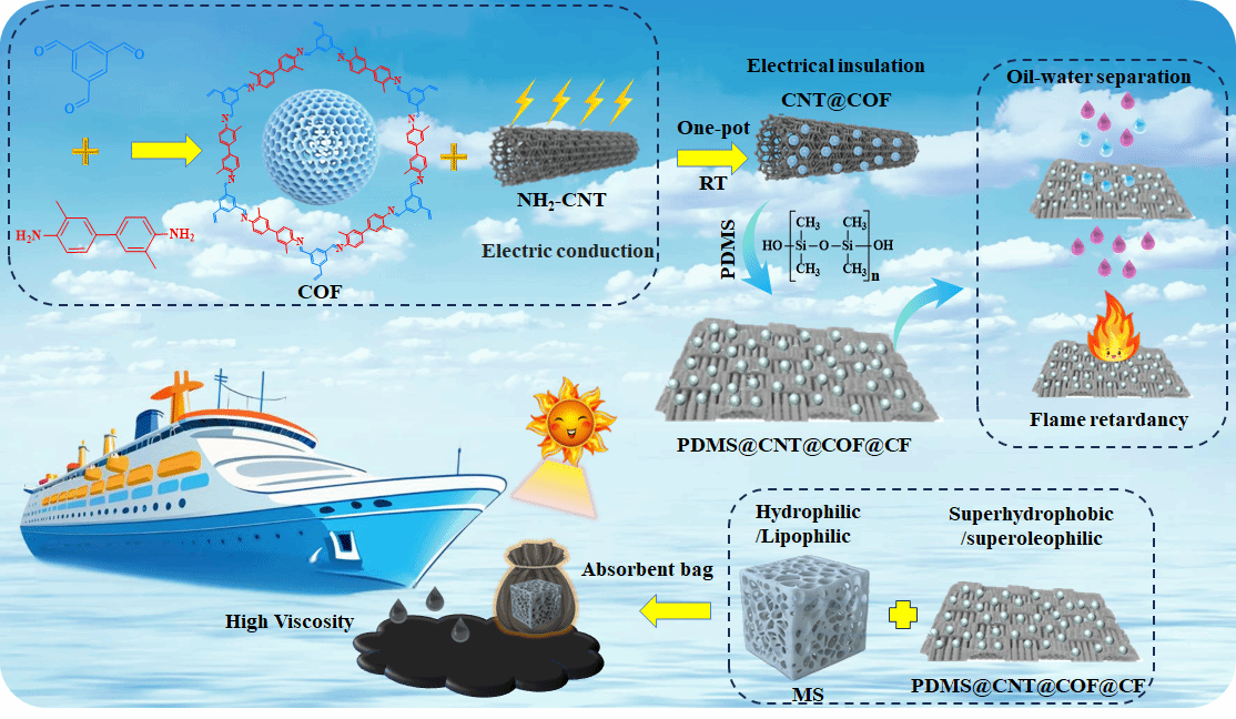 进展二:用于海上溢油高效处理的光热活性超疏水夹层结构三维共价有机框架复合材料