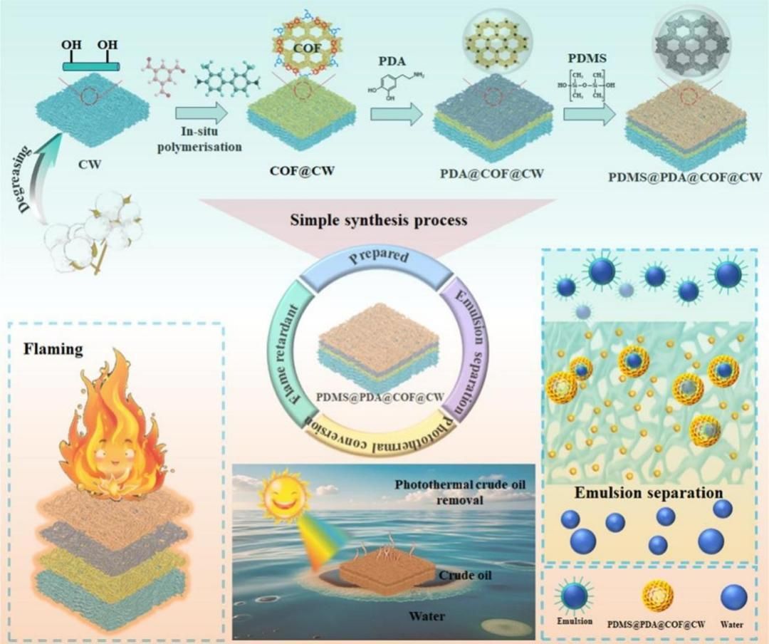 随着全球工业化加速与石油资源过度开采,海上原油泄漏事故频发,不仅对海洋生态系统造成毁灭性破坏,还会引发人体头晕、恶心、呼吸窘迫等健康问题。本研究通过功能协同设计策略,开发出兼具超疏水性、高效光热转换及电绝缘性能的多功能复合膜(PDMS@CNT@COF@CF)。该材料通过室温原位聚合技术,在碳纳米管(CNT)表面沉积共价有机框架(COF)构建而成。随后通过聚二甲基硅氧烷(PDMS)涂层将其牢固锚定于棉织物(CF)基底上。制备的复合膜在空气中展现出优异的超疏水性(水接触角达157.4°),对轻质油与重质油的分离效率均超过96.0%。经30次循环使用后,仍保持98.6%的分离效率及12913.6 L/m⟡·h的通量。此外,原位修饰的COF显著提升材料体积电阻至兆欧级,较纯CNT高出三个数量级。值得注意的是,在1.0 kW/m⟡模拟日光照射下,PDMS@CNT@COF@CF复合材料表面温度于180秒内升至76.3°C。协同光热-超疏水效应显著降低原油粘度,配合蠕动泵系统可实现持续回收。该技术有望加速适应复杂海洋环境的油水分离材料研发进程。