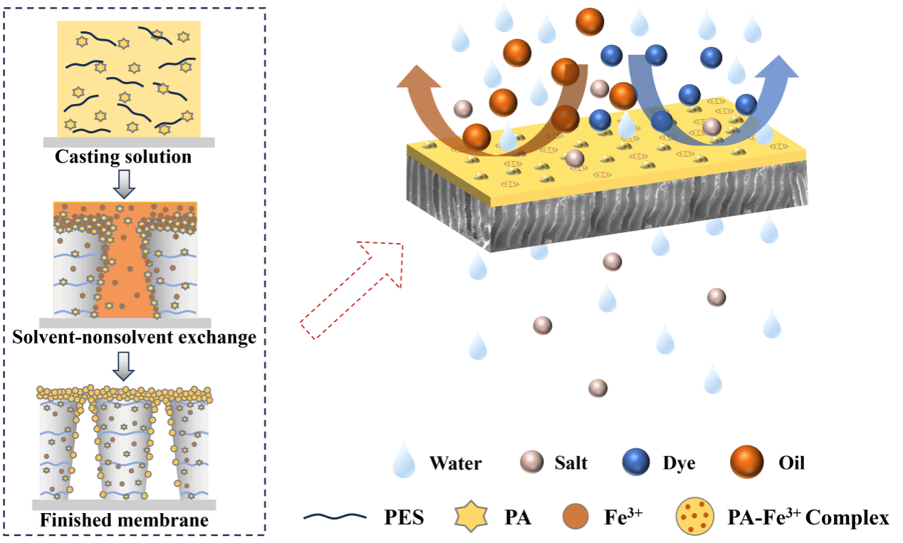 姜忠义教授团队提出了一种基于络合作用的反应增强表面偏析方法,用于制备面向分子/离子分离的抗污染纳滤膜。在铸膜液中引入亲水性植酸(PA)作为表面偏析剂,并在凝固浴中选用具有强络合能力的Fe3+作为交联剂。PA与Fe3+之间的络合作用增强了PA的表面偏析,使PA-Fe3+络合物稳定附着于膜表面,从而构建出亲水且交联的分离层。实验结果表明,优化后的膜表现出优异的性能:水通量为253 L/(m⟡·h·bar),对多种染料具有高截留率(甲基蓝:97.9%,日落黄:96.3%,酸性品红:95.5%,甲基橙:78.8%),染料/盐分离因子超过300,且在表面活性剂稳定的泵油水乳液过滤中通量恢复率超过95%。同时,在连续168小时过滤混合溶液(100 ppm甲基蓝/1000 ppm NaCl)过程中,该膜始终保持对甲基蓝的高截留率与对NaCl的低截留性能。杏吧原创