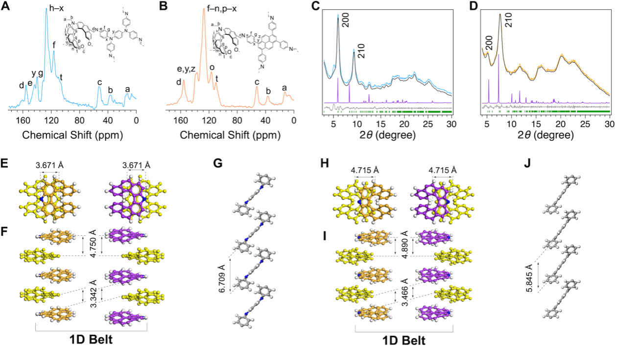 针对这一问题,团队设计合成了咔唑稠合[7]螺烯单体,该单体呈现V型几何结构,两个反应位点夹角104°、垂直间距4.4 Å,这种非常规结构本与传统一维框架生长模式不兼容。研究团队创新性地将其与四取代C₂对称π结单体(TPDA、PyTTA)缩合,得到了具有二重互穿结构的一维带状COFs,实现了拓扑禁阻结构的精准构筑,这也是首次发现一维COFs可形成互穿结构,打破了此前仅三维COFs存在互穿的认知,相关研究成果发表于国际顶级化学期刊《Journal of the American Chemical Society》。杏吧原创