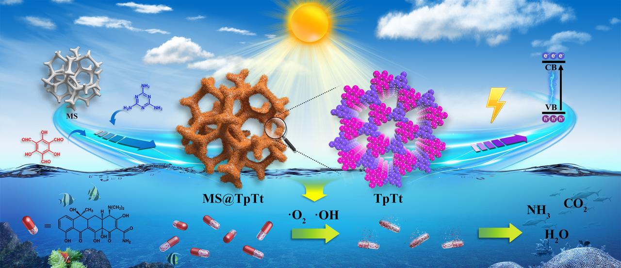 化学工程与技术学院潘勤鹤教授和杨玮婷教授团队采用“反应接种”策略,选用与基底有着同源配体的COF-TpTt,通过一锅法成功制备了一种新型的三聚氰胺@COF复合海绵(图1)。这种策略使小尺寸COF-TpTt在三聚氰胺海绵纤维上均匀、牢固地生长,且表现出比纯COF更高的四环素可见光催化降解性能。复合海绵有效的克服了一般COF粉末特性难以回收利用的问题,在进行10轮循环实验后,仍然表现出非常高的降解效率,并在可见光下对四环素类抗生素均表现出不错的光催化活性。