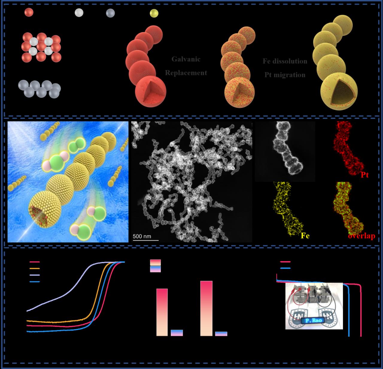 近日,田新龙教授团队在“中国科技期刊卓越行动计划”高起点新刊项目和能源化工领域Top期刊《Carbon Energy》(即时IF=21.8)发表研究论文,论文题目为“One-dimensional Pt-Fe hollow nanochains for efficient oxygen reduction reaction”。2020级博士研究生饶鹏为论文第一作者,邓培林讲师、罗俊明讲师和田新龙教授为共同通讯作者。