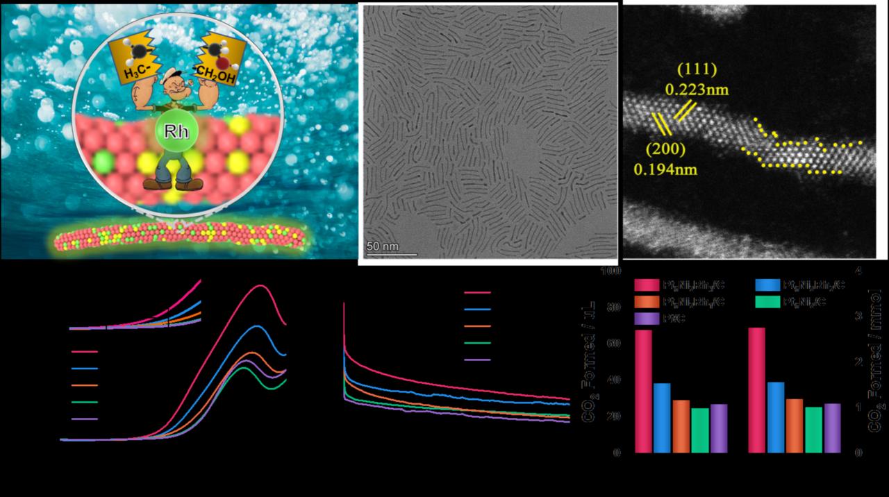 田新龙教授团队提出一种简便的方法,通过在PtNi纳米线(NWs)中掺入Rh,成功制备了PtNiRh三金属纳米线,并将其用于EOR,在酸性溶液中表现出理想的活性和稳定性。与Pt/C和Pt6Ni2NWs/C相比,Pt6Ni2Rh3NWs/C催化剂的催化活性几乎提高了一倍,即使经过长期耐久性试验,其质量活性也是前两者的1.4倍和1.7倍。研究结果表明,其优越性能来自1D超细纳米线与Rh结合的优势。特别是,通过引入Rh,催化剂的CO耐受性大大增强,在相同的持续时间内,Pt6Ni2Rh3NWs/C产生的CO2量达到了最大化。DFT计算进一步证明,Rh的加入提高了EOR的C1途径选择性。这些数据表明,PtNiRh NWs具有良好的C-C键断裂能力,被认为是未来高效燃料电池的有前途的EOR电催化剂。