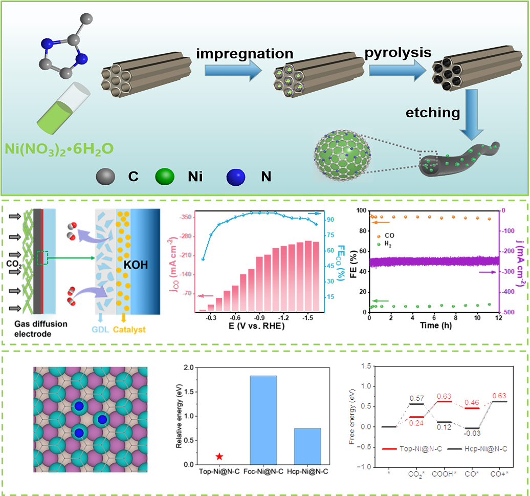 电化学CO2还原反应(CO2RR)因其在降低大气中CO2浓度、实现人类社会碳中和方面的潜在优势,在近十年来引起了广泛的关注。根据热力学过程,CO2分子分别通过2-、6-、8-和12电子转移途径转化为CO、HCOOH、CH3OH、CH4和C2H4,更多的电子转移意味着更高的储能效率,但较低的产品选择性和高的输入功率仍然不能满足CO2RR的商业要求。因此,通过CO2RR将CO2转化为CO电子转移途径的过电位较低,产物选择性接近100%,被认为是目前最接近商业化的途径。