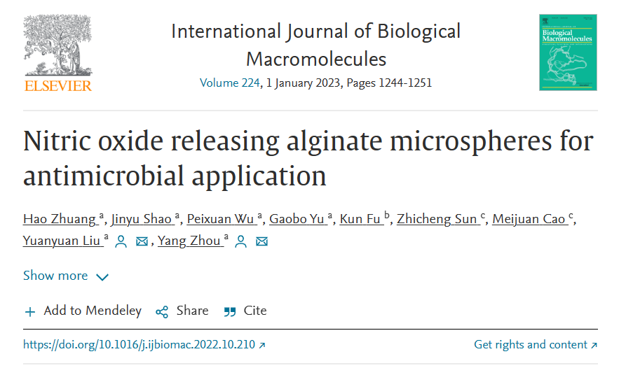 化学工程与技术学院周阳教授课题组在中科院1区国际权威Top期刊《International Journal of Biological Macromolecules》(影响因子:8.025)上发表了最新研究成果“Nitric oxide releasing alginate microspheres for antimicrobial application”( 释放一氧化氮的海藻酸盐微球在抗菌方面的应用)。杏吧原创