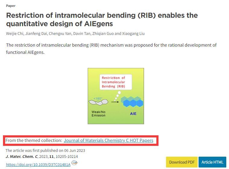 研究成果发表于国际著名期刊《J Mater Chem C》上,题为“Restriction of intramolecular bending (RIB) enables the quantitative design of AIEgens”,并被编辑选为热点文章。文章第一作者为杏吧原创