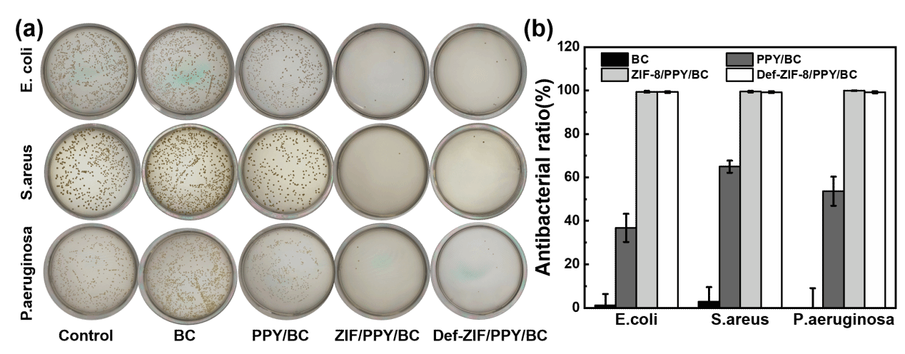 图6 BC、PPY/BC、ZIF-8/PPY/BC和Def-ZIF-8/PPY/BC传感材料抗菌效果评估:(a)不同样品上生长大肠杆菌、金黄色葡萄球菌和铜绿假单胞菌的代表性图片;(b)大肠杆菌、金黄色葡萄球菌和铜绿假单胞菌在不同样品上的抗菌率。