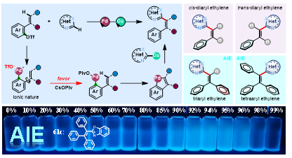 陈铁桥教授课题组利用钯和铜组成的高效双金属协同催化体系,通过C-O裂解和双C-H键活化将杂芳基立体选择性“安装”到邻乙烯基酚氧化物的双键上,高立体选择性地合成对应的含杂芳基的多芳基乙烯化合物。机理研究表明,乙烯基C−H杂芳基化的高区域选择性归因于CsOPiv的使用、通过氧化加成产生的芳基三氟甲磺酸钯的离子性质以及杂芳烃C−H键断裂的相对高的能垒。该反应很好地克服了以往钯迁移/烯基官能化的底物限制,立体选择性地合成了具有高官能团耐受性的顺式二芳基、反式二芳基、三芳基和四芳基乙烯。此类包含杂芳基的多取代乙烯的THF−水混合物和固体粉末的光致发光光谱研究证实其具有聚集诱导发光(AIE)活性。本反应为相关AIE分子库的有效构建提供了高效的方法。