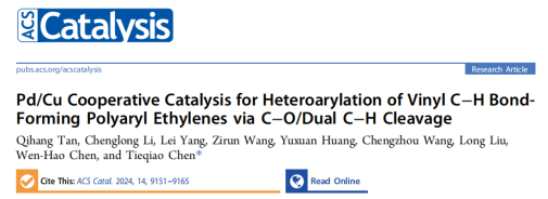 近日,陈铁桥教授团队在中国科学院一区Top期刊《ACS Catalysis》(IF = 12.9)发表题“Pd/Cu Cooperative Catalysis for Heteroarylation of Vinyl C–H Bond Forming Polyaryl Ethylenes via C–O/Dual C–H Cleavage”的研究论文,杏吧原创
