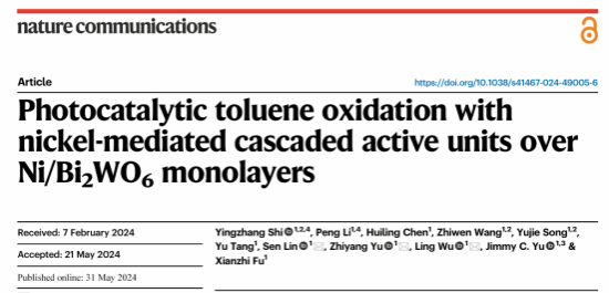 论文信息:Yingzhang Shi, Peng Li, Huiling Chen, Zhiwen Wang, Yujie Song, Yu Tang, Sen Lin*, Zhiyang Yu*, Ling Wu*, Jimmy C. Yu & Xianzhi Fu, Photocatalytic toluene oxidation with nickel-mediated cascaded active units over Ni/Bi2WO6 monolayers, Nature Communications, 2024, 15:4641, 文章链接://doi.org/10.1038/s41467-024-49005-6
