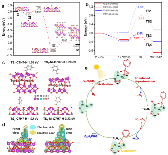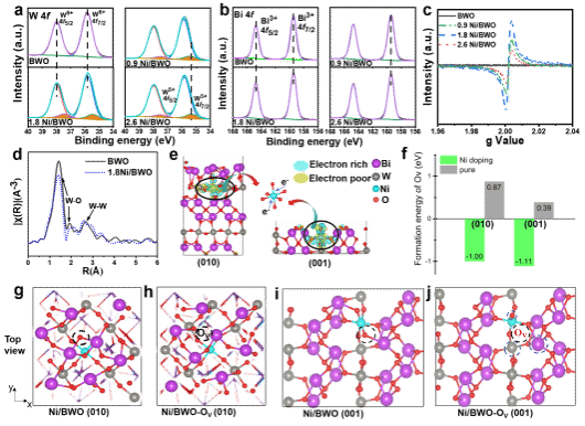 针对这一问题,通过在单层的Bi2WO6纳米片中原位掺杂Ni,创制空间相连的受阻路易斯酸碱对(FLPs)和不饱和W级联活性单元(CAUs)。这种特殊的活性单元中FLPs和不饱和W分别对于C-H键和O2分子有很好的活化作用,促进了C-H键的脱氢和活性氧物种的生成。得益于FLPs和不饱和W在同一活性单元内的级联作用,活性氧转移距离大大缩短,有效避免了活性氧转移对催化性能的抑制,这是光催化性能提升的主要原因。