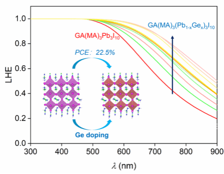 研究成果发表于国际著名期刊《Journal of Materials Chemistry A》(IF=10.7)上,题为“Germanium doping effect on the photoelectronic performance of alternating cations in the interlayer space GA(MA)3(Pb1−xGex)3I10”。第一作者为杏吧原创
