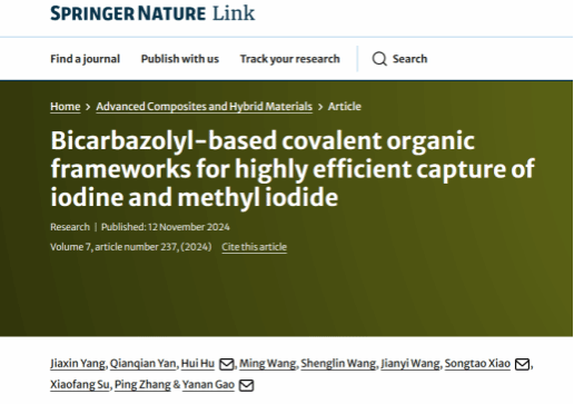环境/能源材料先进制造与应用创新团队与中国原子能科学研究院合作,在国际著名期刊《Advanced Composites and Hybrid Materials》, IF = 23.2 发表题为《Biocarbazoyl-based covalent organic frameworks for highly efficient capture of iodine and methyl iodide》的学术论文,杏吧原创