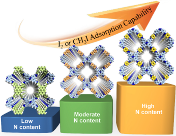 开发具有优异放射性碘化物(主要是分子I2和有机CH3I)捕获性能的多孔材料是核工业面临的持续挑战。目前,许多学者致力于探索具有高比表面积和大孔体积等良好结构性能的新型吸附剂。然而,一些无孔材料也表现出优异的碘吸附能力。因此,目前尚不清楚是哪些因素决定了碘的吸收能力。在本工作中,研究人员通过探索一系列二维供电子含氮共价有机框架(COF)的碘吸附性能研究,提出了一种颠覆先前认知的碘捕获新的概念。通过考察COF的孔结构(从菱形到六边形,从微孔到中孔)对碘吸附性能的影响,发现材料对分子I2或CH3I的吸附能力更可能取决于吸附结合位点的数量,而不是它们的结构特性 (图 1)。这种新的碘捕获模式对于设计用于处理核电站废气的多孔材料具有重要指导意义。