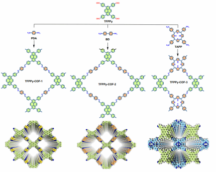图 3. 含芘COFs的设计与合成。