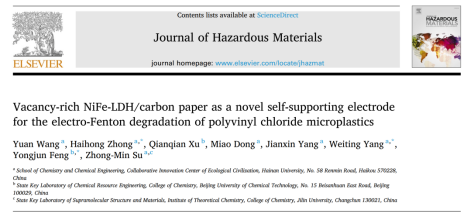 吸附与催化材料团队在Journal of Hazardous Materials上发表题为“Vacancy-rich NiFe-LDH/carbon paper as a novel self-supporting electrode for the electro-Fenton degradation of polyvinyl chloride microplastics”的研究工作。杏吧原创