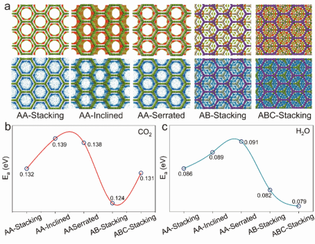 通过分子动力学模拟比较不同中心金属(Co、Ni、Cu、Zn、Mn)的三蝶烯框架发现,钴基三蝶烯框架中水的活化能最低,这归因于ABC堆叠独特的层间错位和分子内氢键促进水分子迁移;而CO2在钴框架中活化能最高,减缓了传输速度。进一步证实了ABC构型的层间区域是CO2/H2O主要富集位点,水分子促进CO2形成氢键稳定的碳酸根,为反应创造有利环境。这些特性共同提升了催化活性和转化效率。