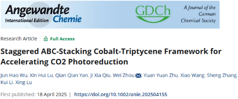 论文信息:Jun Hao Wu, Xin Hui Lu, Qian Qian Yan, Ji Xia Qiu, Wei Zhou*, Yuan Yuan Zhu, Xiao Wang*, Sheng Zhang, Kui Li, Xing Lu*, Staggered ABC-Stacking Cobalt-Triptycene Framework for Accelerating CO2 Photoreduction, 2025, e202504155.