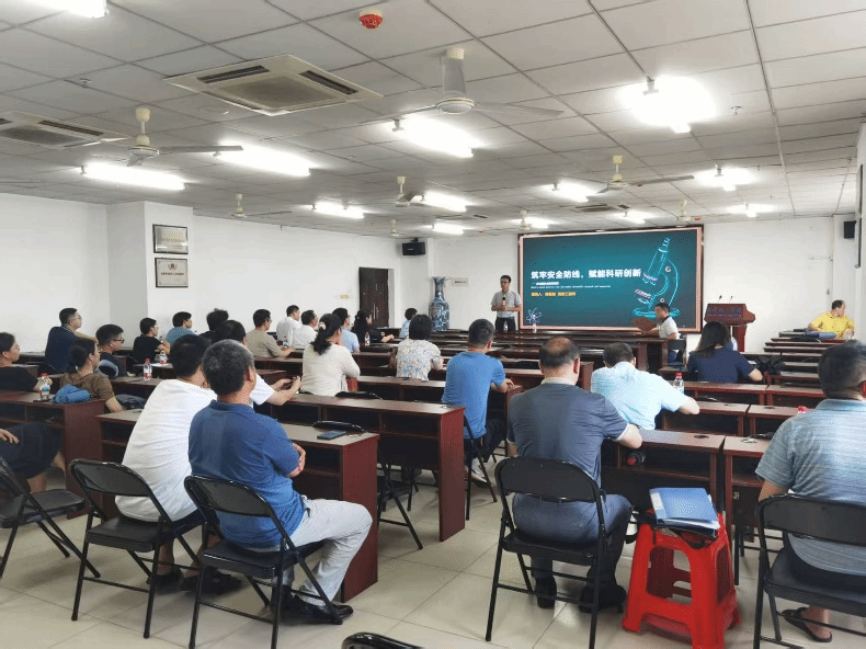 高级工程师梁振益作“筑牢安全防线,赋能科研创新”的主题报告。报告系统梳理了实验室日常管理中的关键规范要点,结合典型事故案例深入剖析风险防控要点,详解各类突发状况的应急处置流程。