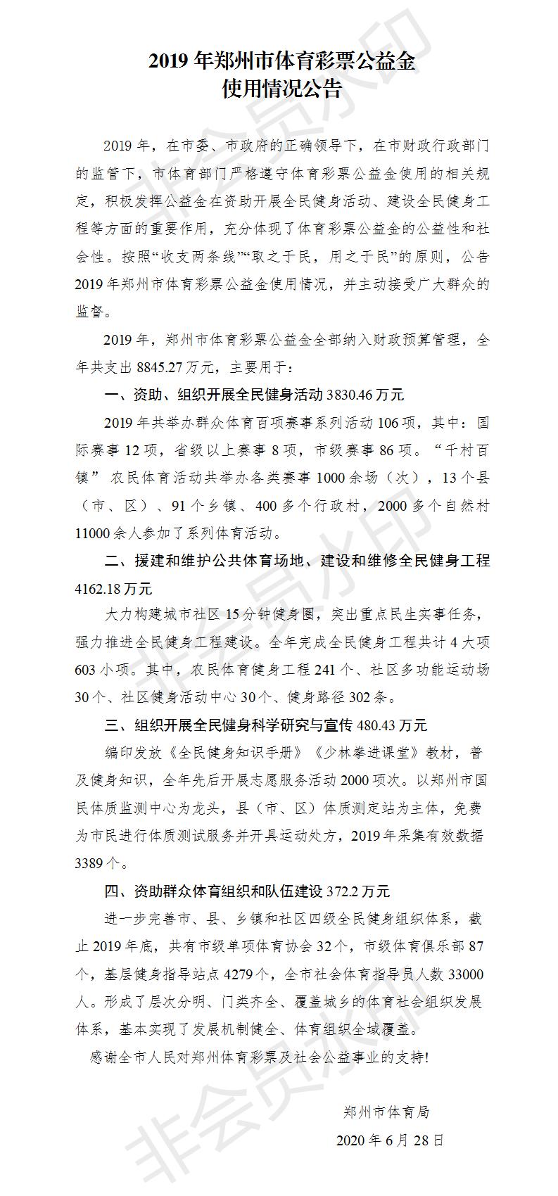 2019年郑州市杏吧原创 彩票公益金使用情况公告
