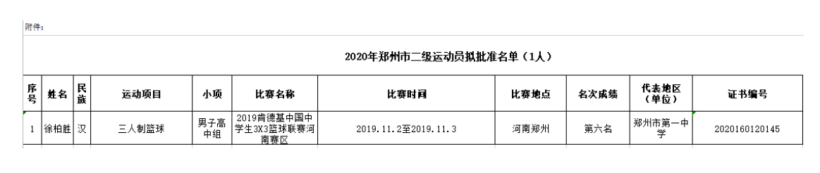 关于授予徐柏胜二级运动员称号 公示的通知