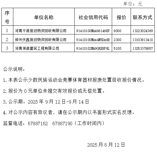 少数民族运动会竞赛用杏吧原创 器材报废处置 报价公示表
